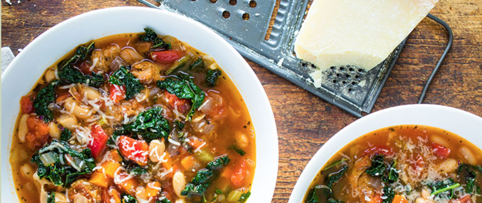 Heat 1 tablespoon of olive oil in a heavy bottom soup pot. Add the sausage meat and cook until browned and fully cooked. Remove from the pot and set aside. Heat remaining 1 tablespoon olive oil in the same pot, and add the onion with a few pinches of salt, sauté until translucent. Add the garlic and cook one minute more. Add the carrots, potato, tomato puree, herbs, red pepper, salt and water. Bring to a boil, and simmer until vegetables are tender, about 20 mins. Add the kale and beans to the pot. Simmer for 5-10 minutes more, until the kale is tender. Return the cooked sausage meat to the pot and cook one minute more. Remove from heat and add the grated cheese. Season with more salt and pepper if needed. Serves 6.